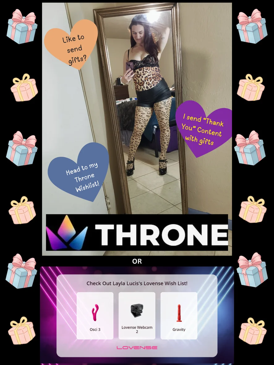 Surprise me 🙈 Spoil me 💕 Maintain My Royal Kingdom 🏰 Enjoy exclusive content made just for you as a dedicated Royal "Thank You!! 😘" from the Princess when you send me a gift! 🎁 See something missing that you want me to have? 👀 Request for me to add it to my wishlist so we can fulfill your most secret desires! 😈 P.S. Crowd Funding is Available on the Sex Machine 😍 Lovense List Also Available 💖 https://www.lovense.com/wish-list/0xw6scq https://throne.com/laylalucis